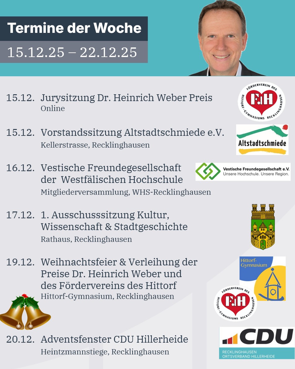 mehrIch weiß nicht, wie es Euch so geht ? noch stellen sich keine Weihnachtsgefühle ein. Kommt aber noch. 😊 🥇Los ging die Woche mit der Jury-Sitzung zur Preisverleihung des Dr. Heinrich Weber Preises, der von der Familie des Physikers gestiftet wird und vom @hittorf.foerderverein des Gymnasiums für besondere Leistungen in den Fächern Physik, Mathematik und sozialen Engagement vergeben wird. Am Abend dann die erste Vorstandssitzung des neu gewählten Vorstands der Altstadtschmiede e.V., wo wir einen ersten Ausblick auf 2026 getroffen haben. In der Mitgliederversammlung der vestischen Freundegesellschaft unserer Hochschule hier am Standort Recklinghausen haben wir mit großem Dank den bisherigen Geschäftsführer und jetzigen Bürgermeister Axel Tschersich verabschiedet. Die Geschäftsführung bleibt jedoch in guten Händen bei der Stadt Recklinghausen: Einstimmig ist Hendrik Eßers, der Fachbereichsleiter der Wirtschaftsförderung, zum Nachfolger gewählt worden. Am Mittwoch dann die erste Sitzung des Ausschusses für Kultur, Wissenschaft und Stadtgeschichte im Rathaus, in der ich als sachkundiger Bürger mitwirken darf. Weihnachtlich und auch für mich der eigentliche Auftakt der Weihnachtszeit ist die feierliche Preisverleihung des Dr. Heinrich Weber Preises und des Preises des Fördervereins im Rahmen der Weihnachtsfeier am Hittorf-Gymnasium. Und adventlich/weihnachtlich geht es am Samstag weiter beim offenen Adventsfenster, wo die @cdu_recklinghausen_hillerheide zu Glühwein und Snacks eingeladen hat. Euch noch eine schöne Woche und Adventszeit. 🎅🌲